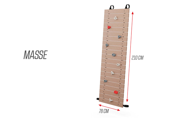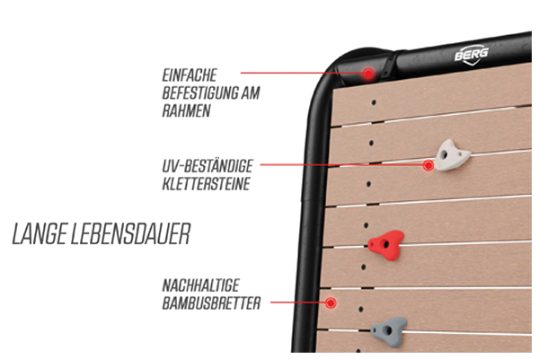 Die PlayBase Kletterwand besteht aus robusten, nachhaltigen Bambusplatten, die auf einem schwarzen Stahlrahmen montiert sind. Die 10 mitgelieferten Klettergriffe sind in zwei Grautönen und Rot gehalten. Sie bestehen aus dem gleichen Material wie Klettergriffe in Hallen und verfügen über eine strukturierte Oberfläche für optimalen Halt beim Klettern.